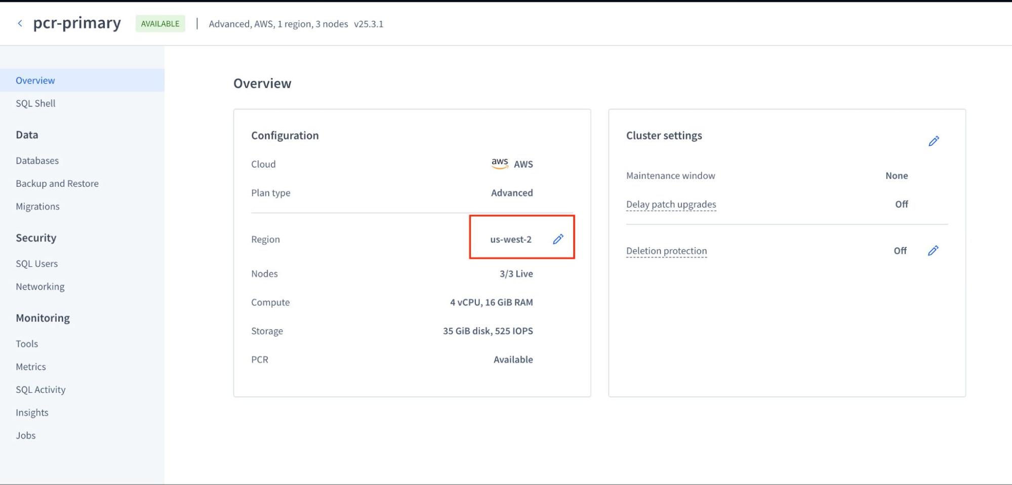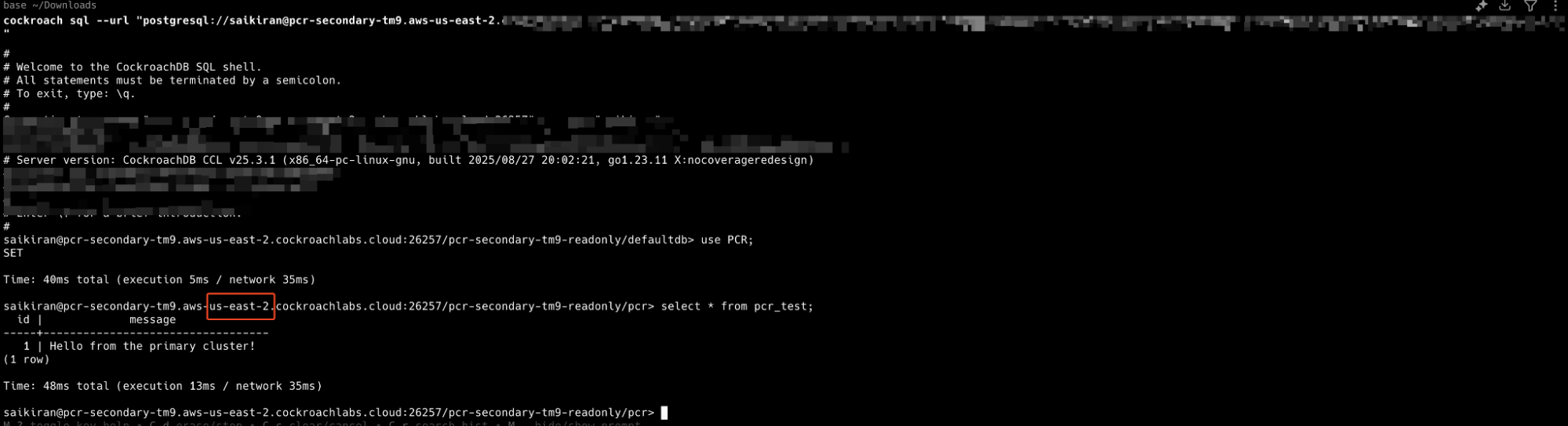 CREATE TABLE pcr_test ( id INT PRIMARY KEY, message STRING ); INSERT INTO pcr_test (id, message) VALUES (1, 'Hello from the primary cluster!'); After executing these commands on your pcr-primary (us-west-2) cluster, the new pcr_test table and its data are written. Behind the scenes, PCR captures these changes and streams them over to the pcr-secondary cluster. Depending on your network and workload, this happens within seconds.