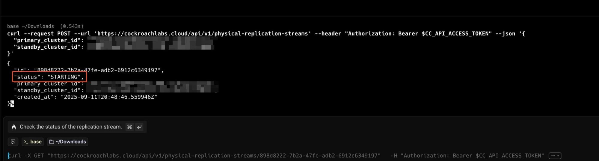 This command initiates the replication stream between your primary and standby clusters. The API response will provide the stream's ID and its initial status, often showing as STARTING while the cloud platform prepares the clusters and network links.