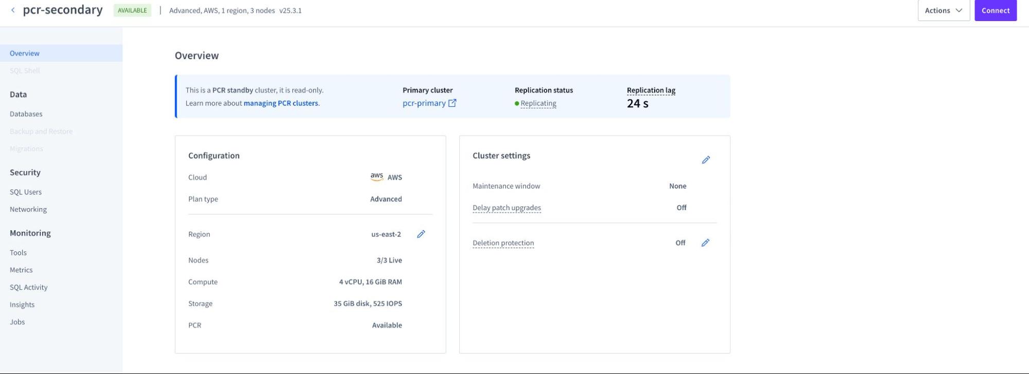 Operationally, PCR simplifies disaster recovery management by eliminating the need to maintain and monitor SQL-level replication. There’s no need to manually handle schema changes, remember to add newly created tables to replication streams, or track replication jobs. PCR automatically replicates data at the cluster level, making it a fully managed, low-maintenance DR solution.