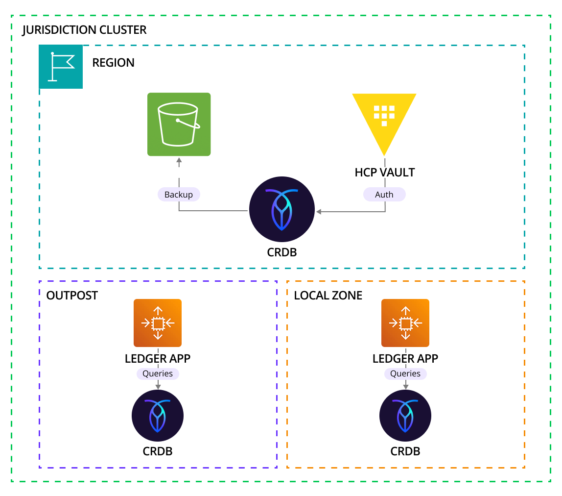 As mentioned above, FanDuel is required to run a ledger and a database(s) in each state they do business. That means their deployment spans across 28 sites and each site has up to three deployment locations. They leverage a combination of AWS Regional Data Centers, AWS Outposts, and AWS Local Zones. Below is an example of what the cluster looks like using three different sites within one locality (i.e. state).